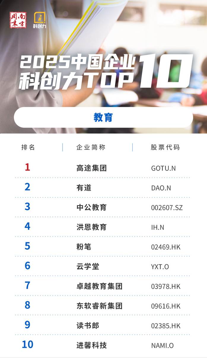 南方周末科创力研究中心建立的“中国企业科创力数据库”,覆盖了国内外资本市场主要上市公司及优质未上市企业,通过研发投入、研发产出、企业发展三个维度项指标进行综合评估。年度超家企业的评选中,高途集团以综合评分第一的成绩位列榜首,荣登《南方周末》“2025中国企业科创力教育榜”第一名。